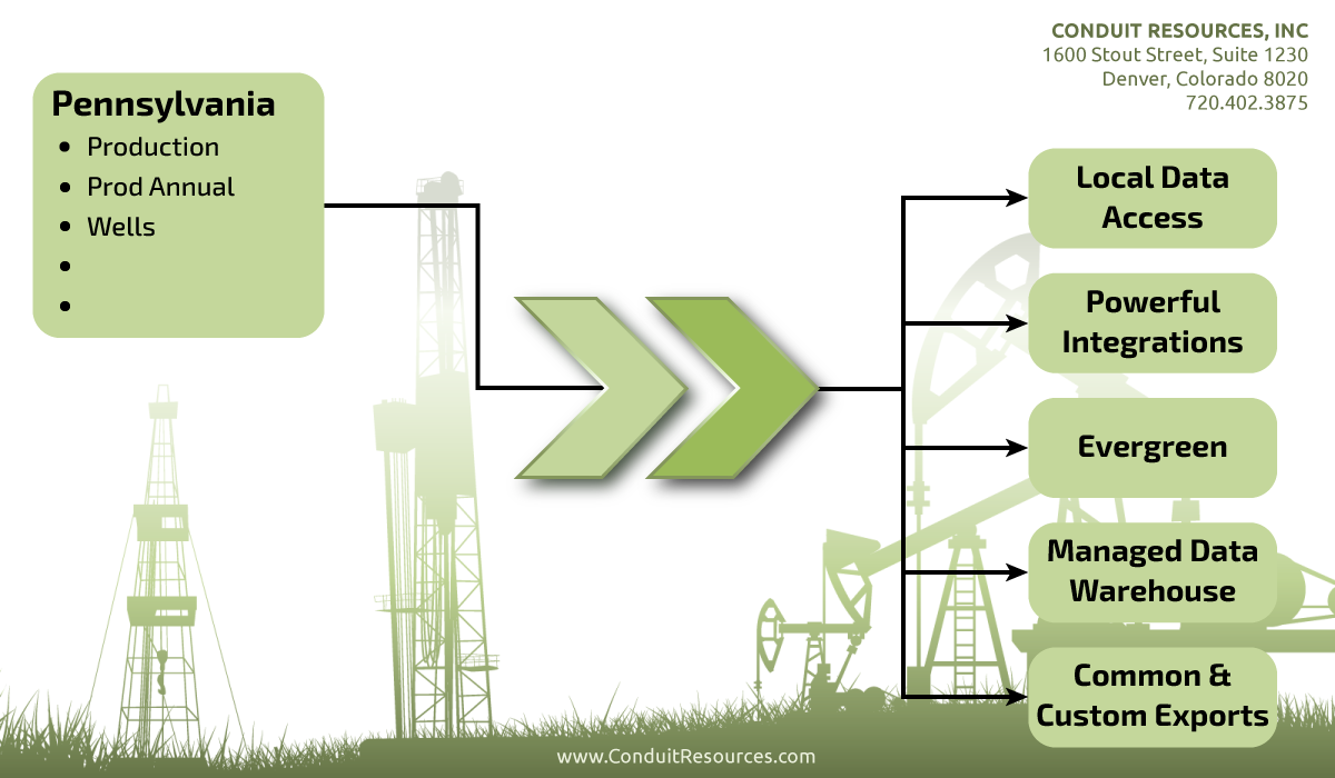 The Energy Data Conduit for Pennsylvania provides local access to the publicly available oil and gas data for Pennsylvania, maintained in a local SQL Server database on your network.